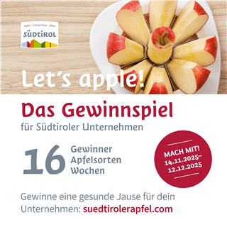 Seit Freitag, 14. November, ruft das Südtiroler Apfelkonsortium Unternehmen dazu auf, den Tag des Apfels gemeinsam zu feiern: mit dem beliebten Gewinnspiel „Let’s Apple“. Äpfel sind nicht nur gesund, sondern auch vielfältig: Die Gewinner dürfen sich über 16 verschiedene Sorten freuen, die sie über mehrere Wochen hinweg kennenlernen können, jede Woc